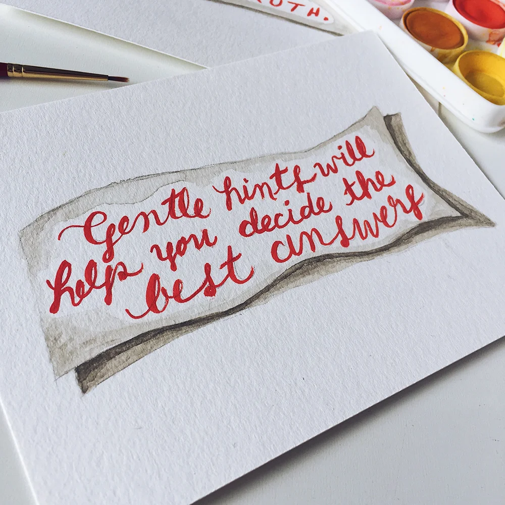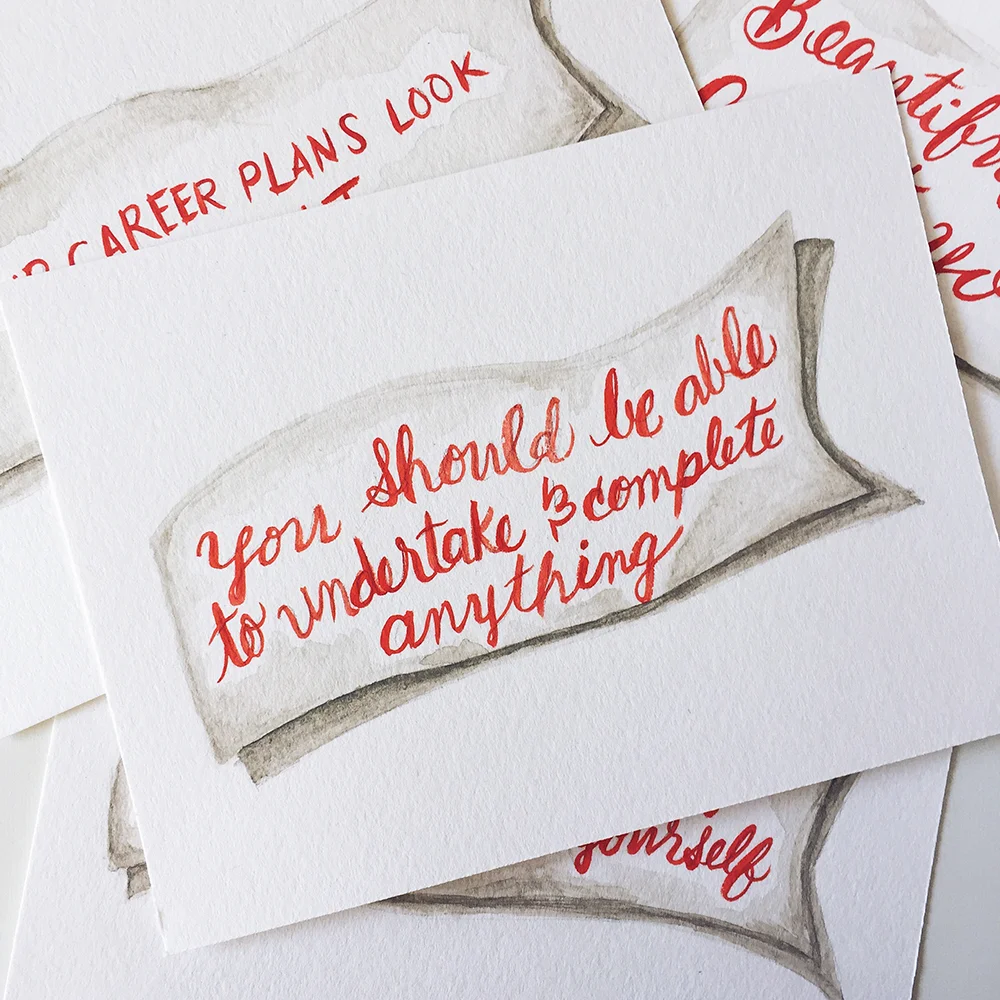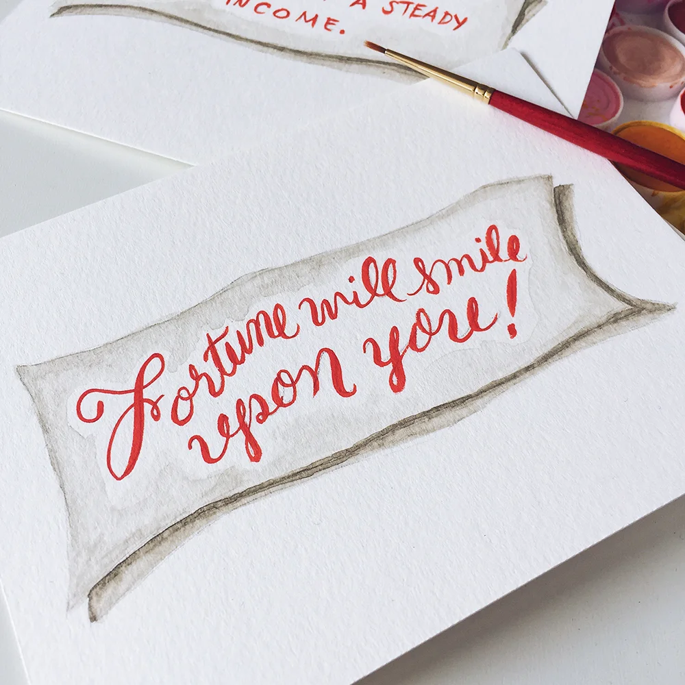 My favorite part of eating Chinese takeout? The fortune cookies. I've collected quite a few that have really resonated with my life situation in the instance I read it. So, I thought I'd share a few favorites from my collection, hand-lettered and water-colored, of course.